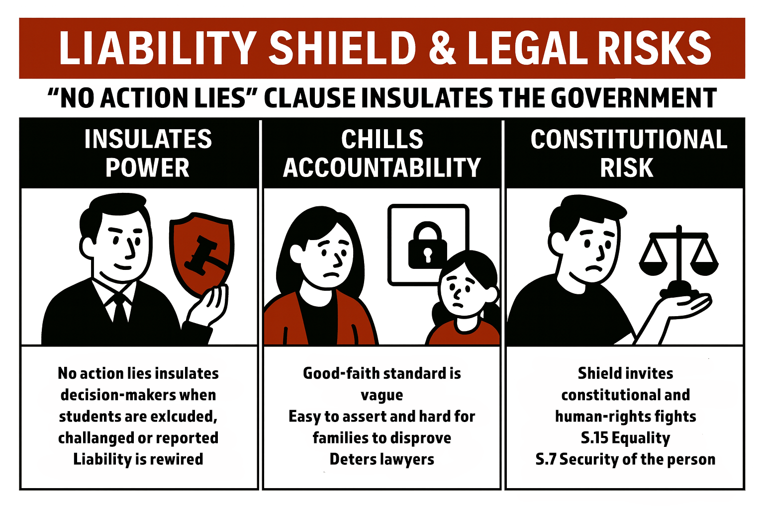 Bill 29 doesn’t just exclude; it tries to immunize itself. The “no action lies” clause aims to shield the Crown and implementers for decisions made in “good faith,” making it harder for families to seek redress when harms occur. Legal observers—including the Canadian Bar Association–Alberta—warn the scheme is constitutionally vulnerable: it engages Charter equality, privacy, and security interests, and may collide with human-rights and privacy statutes. Even if ordinary lawsuits are chilled, judicial review, human-rights complaints, and Charter remedies remain—and the province’s broad shield signals indifference to accountability. In practice, it encourages overreach first, defenses later, with students paying the price.